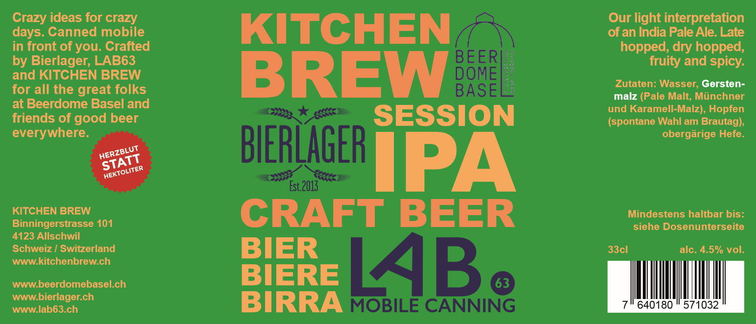 Together with KITCHENBREW we will be live showcasing our mobile canning process as part of the international beer-festival "Beer Dome Basel 2019" at the Markthalle Basel. This collab with Bierlager.ch and KITCHENBREW takes place in front of Markthalle Basel and can be attended free of charge. You can get the brew right from the canning line into your hands, super freshy fresh!